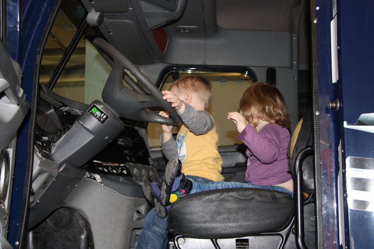 В начале экспозиции встретила нас кабина от фуры, дети там с удовольствием полазили, покрутили огромный руль.