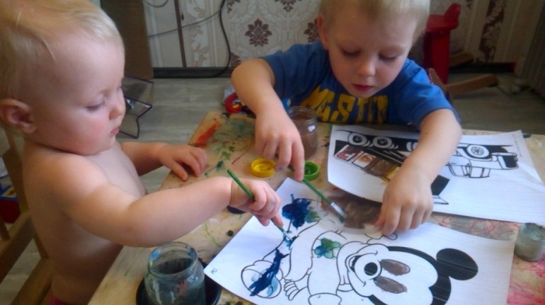 Ну это мы рисуем) Больше всего любим гуашью. Вова правда развлекается перемешиванием всех красок. А Мила рисует, но в одном месте, и еще ей понравилось руку свою закрашивать,долго этим занималась))
