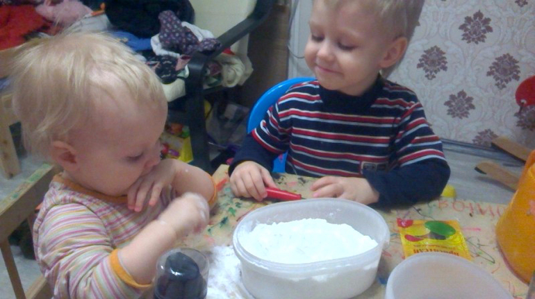ну в общем детям понравилось))) правда закончилось все очень печально. моя вина конечно...убрала со стола все ингредиенты чтобы не мешались, а вот лейку с водой оставила....в итоге мила разлила воду....ооо это было ужасно...вместо простого пылесосения, вытирать этот развязший крахмал...бррр...а я сейчас вообще полы не мою,эт оч тяжко мне, максимум вытереть что-то,а тут пол комнаты, коридор, ванная все в этом крахмале цветном, он еще и мыльный от пены, размазывается не фига не вытирается....ооо бедааа...кое как убрала, и то конечно с разводами...