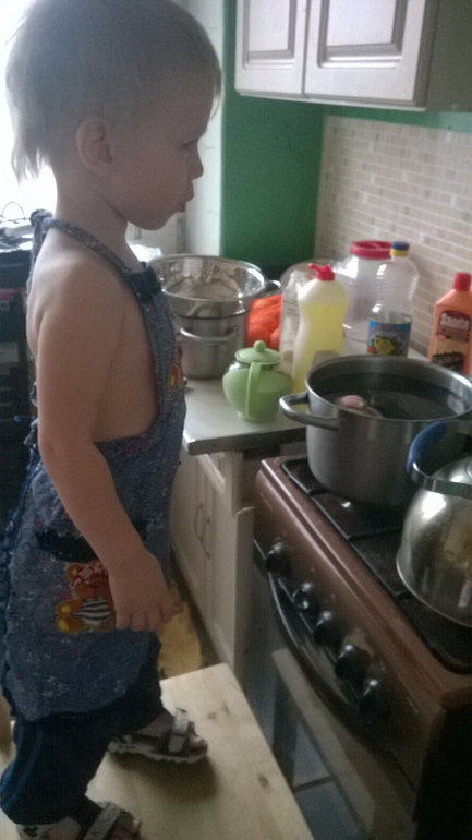 я обычно готовлю пока они спят днем,но сеня у нас не чего было кушать,надо варить) Вова повар (кстати в передничке сшитом мною в 5ом классе на труде) Жалко Мила еще не может участвовать в процессе...ну она ела морковку)))
