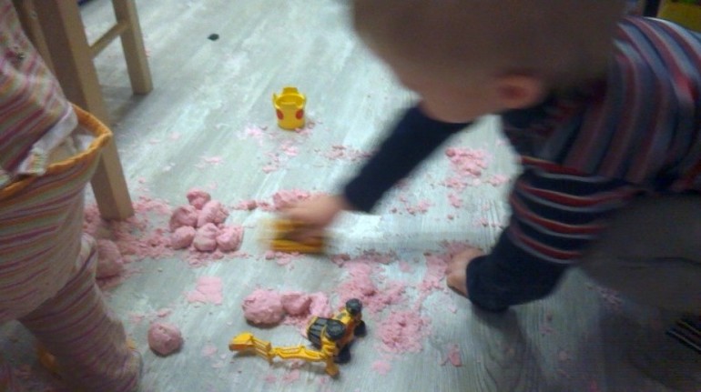 правда такой песок более рассыпчатый, ну и Мила у нас тоже рассыпчивая)) еслиб один Вова был, было бы аккуратнее...подумала надо было сразу на полу делать...мы когда покупным играли так такого бардака не было...