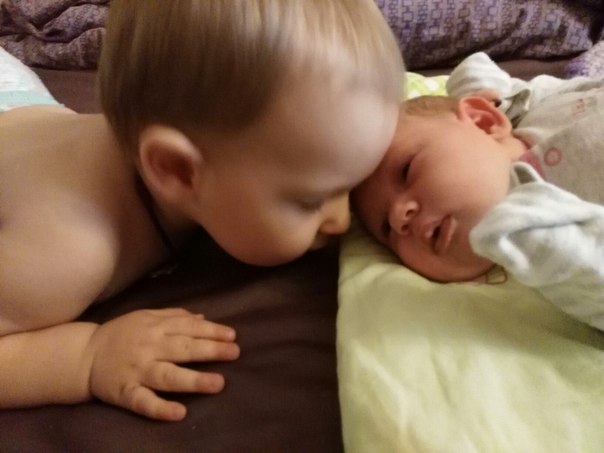 Итак, больше всего я боялась... ревности. Сын у меня темпераментный, активный парень, случаются у него и истерики, иногда кажется на пустом месте. Мой больной беременный мозг рисовал мне страшные картины, как старший будет отвоёвывать свою порцию родительского внимания. Но, тут я ошибалась. Может быть, всё ещё впереди, но пока сынок относится к сестрёнке по-доброму, гладит её, рассматривает маленькие ручки/ножки, обнимает наваливается всем своим весом. Самое опасное, что он делает - это пытается потрогать её ногой) но мы объясняем, что так делать не надо. Вообще, пока сплошное умиление, суёт ей свои соски, бутылочки, когда я его спрашиваю "сестрёнку любишь?", он прикладывается к её головке своей.