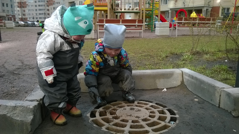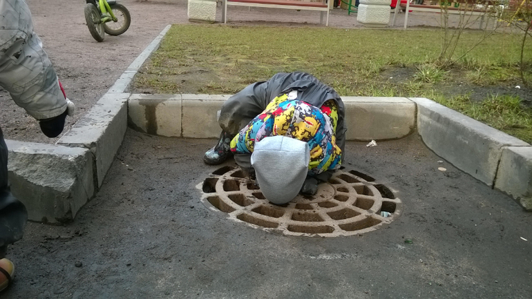 а это они камни кидают в люк. кто-нибудь, кстати, в курсе это разрешено? я наблюдала за этим, но всё время думала, что подойдёт сейчас к нам дядя в погонах, и скажет:"Пройдёмте в камеру, Вы портите водосток, наказание Вам - 5 "заныров" в канализацию за камнями!"