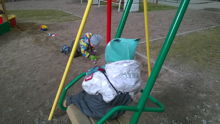 Мои поросята, как всегда извалялись - ползали на коленках, сидели на попе, даже нашли лужу, ну как лужу... немного влажную грязь. Не знаю почему, но местные мамы косятся на меня и на моих хрюх, может, они боятся, что свинство заразно)) и дети тоже косятся, но с надеждой, что их тоже валяться пустят, но нет. Вот сегодня девочка увидела Елисея, прыгающего в этой жиже и Ясю камешки в ней собирающею, рванула к ним, так бабушка остановила её и говорит:"Не надо, у тебя варежки(!!!!!) будут грязные". Серьёзно!? Варежки?! Зачем тогда выход...ладно, будем гулять дальше - есть ещё надежда встретить однохлевника)))