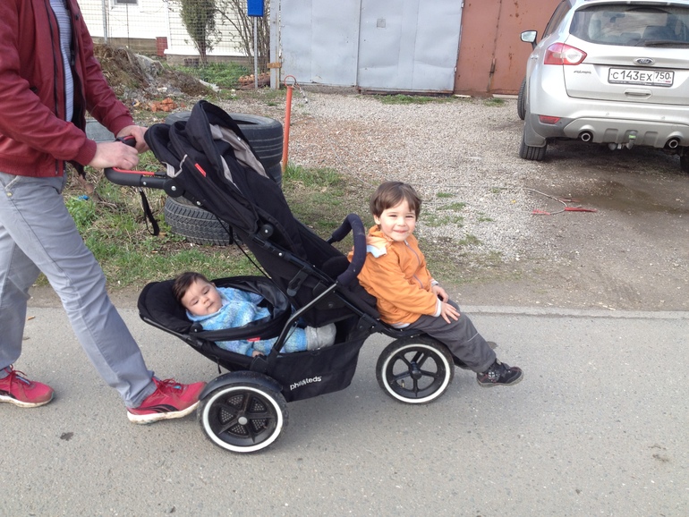 Еще раз отмечу, что коляска меня безумно выручает! Да еще и погода радует теплом, в том смысле, что Вовку теперь я могу быстренько приодеть, Леньку тоже - и как только Вова начинает "хотеть то, не знаю что" - я быстро их собираю, накидываю ветровку, ноги в "кроксы", немного возмущения при упаковывании в коляску и кааайффф! Я хожу по улицам поселка и подглядываю, что там у кого посажено и как, представляю, как у меня все будет)). А какой аромат от цветущих деревьев...мммм!