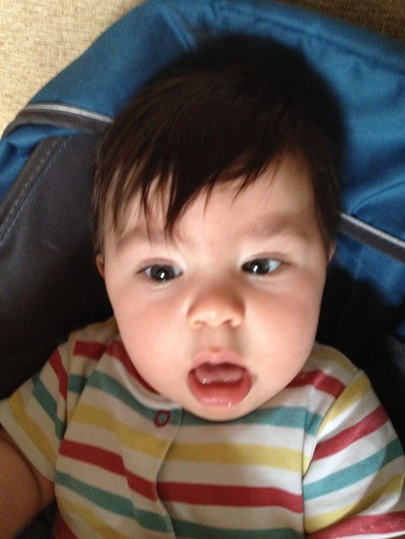 Вовка. Улыбчивый относительно спокойный рассудительный черепашонок). С 9 мая начали делать массаж, и уже отмечаем активность во всем теле)). Косматый такой, что буду стричь (чтобы в глаза не лезла челка и шейка не потела). В 4 месяца может еще рано?))(понты:)))