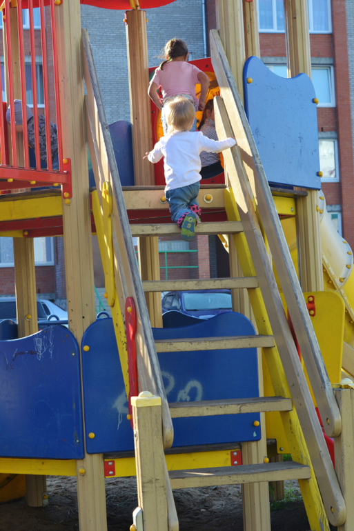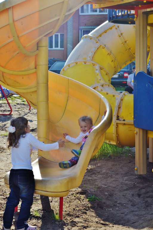 А вот так Лестёна забирается сама на горку, потом выбирает, с какой из трёх поедет (я смотрю - к выходу какой горки мне подойти), съезжает...