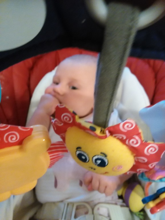 или люльке и смотрит игрушки, а мы с Родюшком её развлекаем, он показывает игрушки, гладит, болтаем все дружно)) попутно я кормлю Родюшка, пытаюсь ещё утром запустить стирку, перемыть посуду и убрать игрушки, которые Родион постоянно раскидывает.