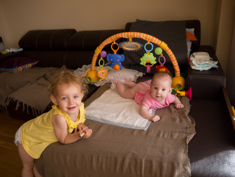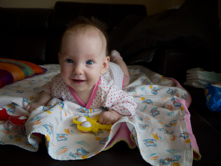 Лидушка здорово подросла за этот месяц, стала намного больше бодрствовать, подолгу лежать на животике с игрушками, вертится во всю со спины на живот и обратно через оба бока. Лежа на животике поднимает корпус на вытянутых руках, пытается встать на колени, поднимая попку:)) Отличает своих от чужих. Улыбается очень много и смеется в голос. Любит очень воду в отличии от Леры, из ванны выходить не хочет, даже если проплавала минут 20 уже и явно устала)) Не любит быть одна, положить под мобиль с погремухами и уйти в другую комнату не получится, кто-то всегда должен быть в зоне видимости.