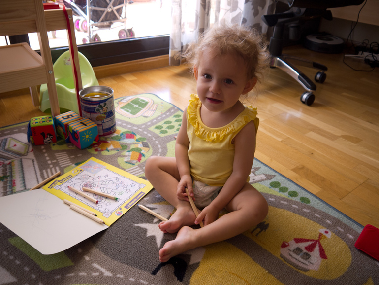 Щелкает как орешки все пазлы и сортеры, что есть дома, полюбила наклейки, по-прежнему много читаем с ней книжки, но Лера предпочитает, чтобы рассказывали по картинкам, а не читали текст. Всех персонажей в книжках знает, до мелочей все все показывает. Строит башни из всего, что под руку подвернется) Любит рисовать, а вот пластилин до сих пор не особо жалует.