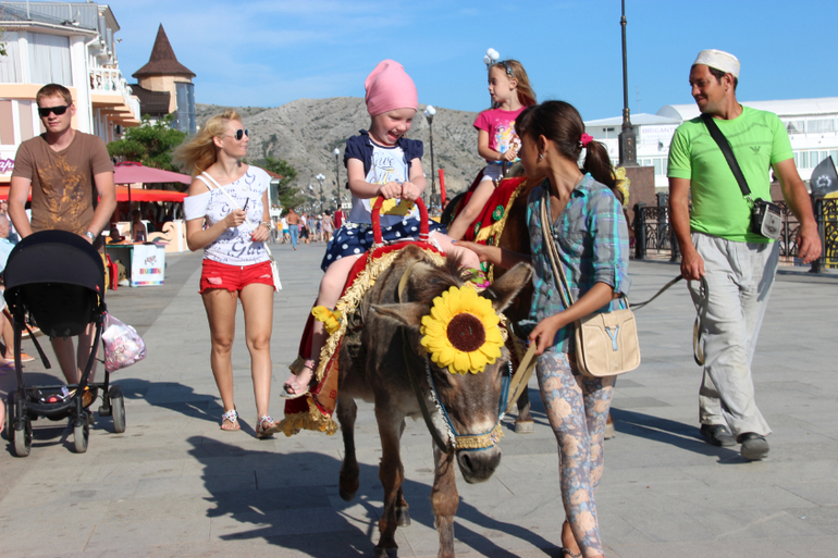 На последней неделе детки стали вспоминать о доме,и мы решили немного разнообразить их отдых и поехали в г.Судак,погуляли по набережной, покатали детей на лошадках,карусельках,поужинали в турецком ресторане,наелись мороженного,купили крымской косметики и поехали в Канаку. Софина ходила и говорила,что мы очень круто погуляли)![]()