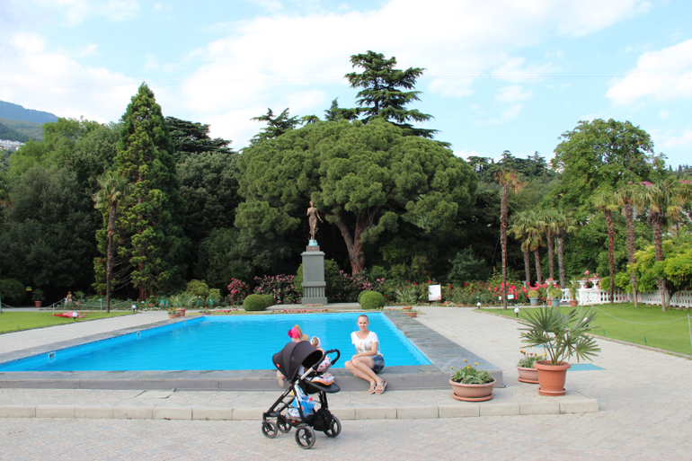 После крокодильей фермы мы спустились на Ялтинскую набережную.Особо впечатлений она не вызвала,прошлись чуть и поехали в "Никитский ботанический сад". Сад был призван способствовать ускоренному развитию сельскохозяйственного производства юга страны на основе интродукции, акклиматизации, селекции и широкого распространения южных плодовых, цветочных, декоративных, новых технических, лекарственных и других полезных растений, изучения и активного использования местных растительных ресурсов. Столько видов растений я видела впервые в своей жизни,хотя жила в Кисловодске 5 лет,а там располагается парк,известный во всем мире! Жаль,что мы не увидели тропических бабочек,был не сезон,но до места их обитания дошли.Вход в парк стоит 200 руб для взрослого и 100 руб. - для ребенка.Но имеются льготы,мы,как многодетные,под них попали (я вычитала;)),и вход был бесплатный.В саду имеется карта сада,но мы шли немного другими путями,потому что была коляска,в по ступенькам ее тащить не хотелось.По дороге вниз парка, нам пришлось увидеть широко известное фисташковое дерево,которому более 1000 лет!!! Не залезть на него я просто не могла;)