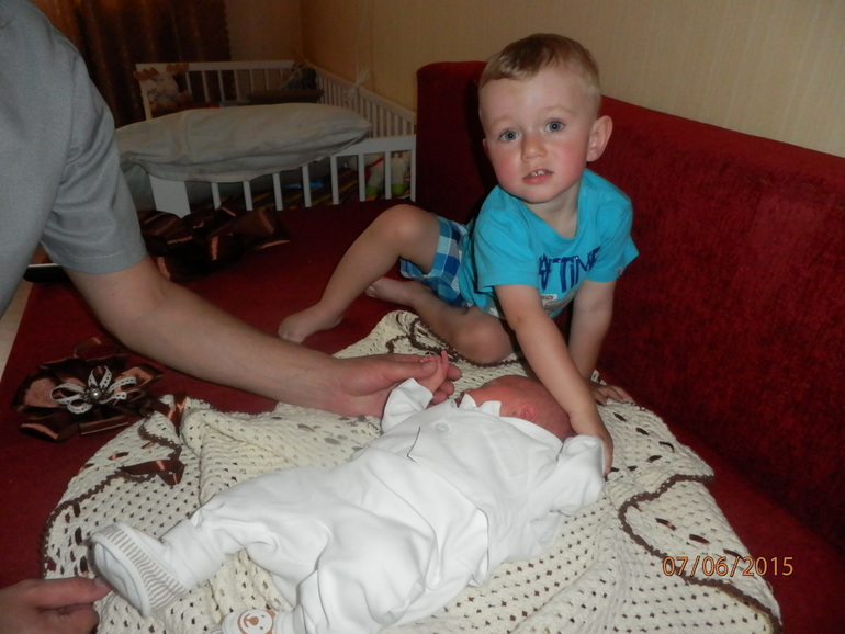 Встреча братишек прошла спокойно, Димуля поцеловал братика, потрогал, в общем был немного растерян, все таки много людей, дома уже посмелее стал к нему подходить, трогать его аккуратненько. Первое время все старался принимать участие в смене подгузников и обработке пупка, даже однажды обсыпал малыша присыпкой пока я отвернулась на секунду, пытался залезть к Роме в кроватку, но потом его рвение поугасло, теперь редко подходит, но если подходит, то целует братика и гладит.