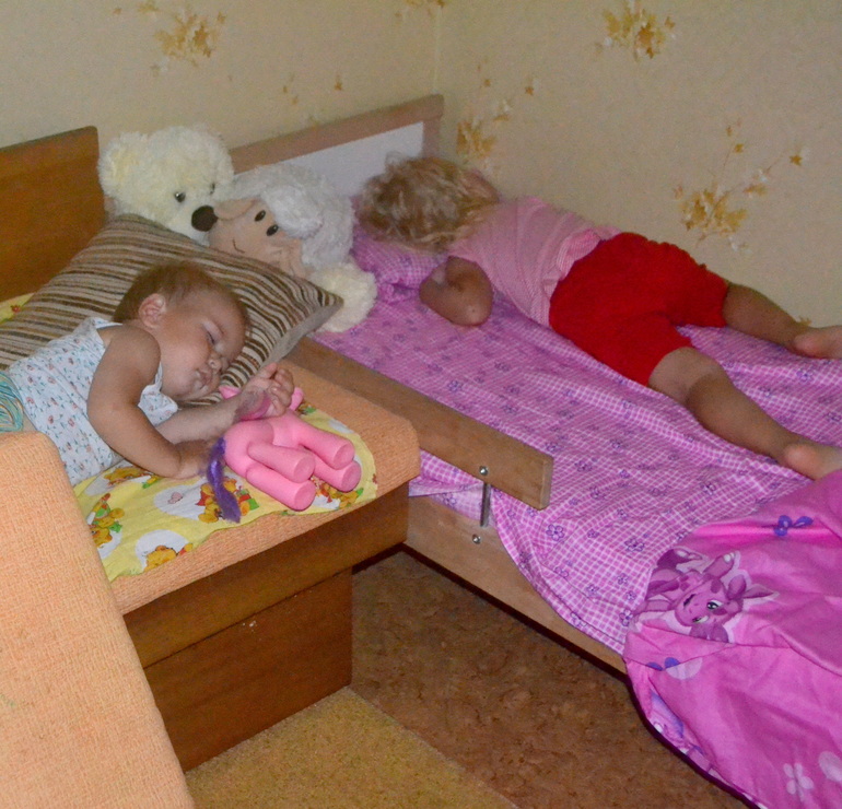 Я поставила старый диванчик к кровати Алёны и решила усыпить их в детской ,на своих кроватях!А не на моей)
