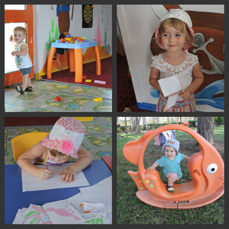 Уезжать было грустно. Но Софии уже надоело, она хотела домой! И весь последний день только и твердила об этом. Антон вел там себя очень свободно, всем улыбался, в коляске и не сидел)) София любила играть в мини клубе "на дипломы", получила там медаль, раскрасила футболку, танцевала, играла в Пиратов....А еще, турки почему -то любили фоткаться с нашими детьми)