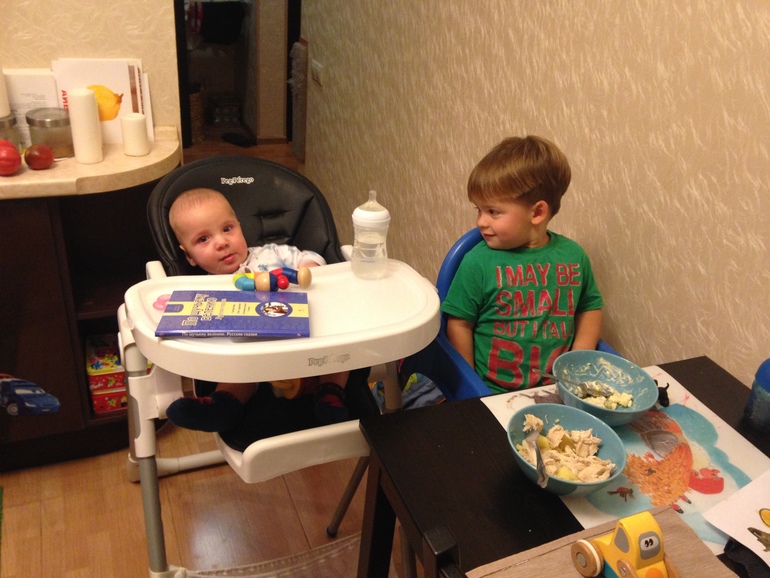 Один наш деньКогда Сашка ест всегда говорит балы и тычет пальцем рядом с собой, означает что братика надо посадить рядом и никак иначе 😻
