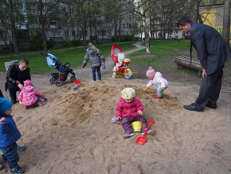 Я в выходные иногда отправляю одного с двумя. Так в будни приезжает в 21.00 уже не до гулянок :-/ а когда гуляет лепит куличики :)