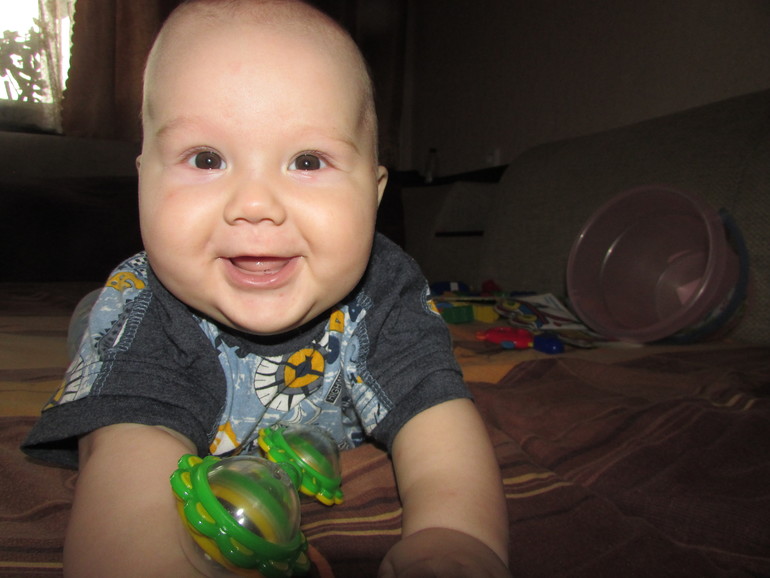 - Кирюша. Большой и толстый хомяк. Ест/спит/трепит нервы маме играет. Играет сказано громко, лежать он не хочет, сидеть не может, на спине не интересно - повернусь-ка я на живот, неее на животе плохо-поору маму.. и так по кругу. "Болтает", хохочет, любит наблюдать за братом и облизывать его. После того, как Кирилл освоил такой интересный навык как переворот, он его делает и днем и ночью. особенно ночью, перевернется и недовольно зовет маму на помощь. Всю ночь переворачиваю, поэтому спит со мной. Все довольны! Умеет всё, что должен уметь в свои 5 месяцев. С этим даже не заморачиваюсь. Единственное, о чем я мечтаю, это когда он сядет. Уж очень сынуля тяжелый для своего возраста.