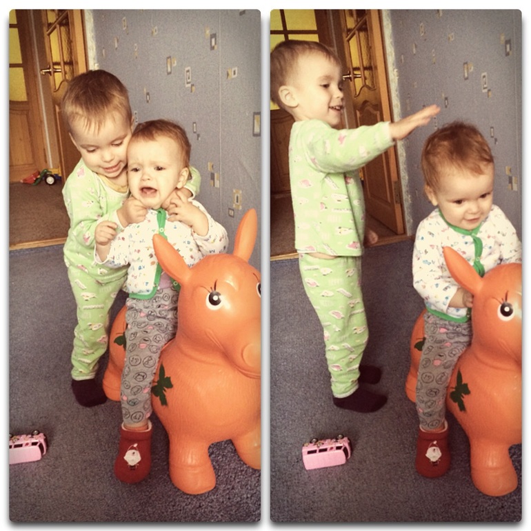 Чаще всего вижу такие картины- они что то друг у друга отбирают, старший у младшей чаще, понятное дело. Доча ревнует, когда я обнимаю Кирилла, начинается ор, и она лезет ко мне на голову. Алисе в 90% случаев не интересно играть с Кириллом. Ей интересно ходить и гудеть маме в уши.. Кириллу с ней поинтереснее, ведь ее можно помучить, помутузить или укусить