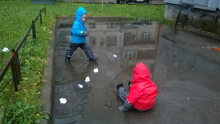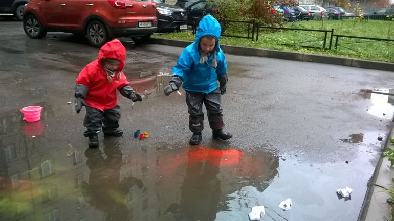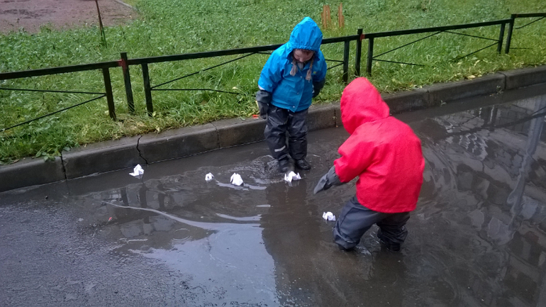 Отдых с погодкамиЗатосковала я сегодня - нет сил сидеть дома! Можно я перемотаю ближайший месяц и сразу окажусь в своём доме)) На улице идёт дождь, но моих уже особо не удивишь прыганием по лужам - резиновая одежда годичной давности притупила ощущения)) ну лужа и лужа, эка невидаль! Взяла я бумагу и начала складывать пароходики (единственная фигурка оригами, на которую я способна), в сумку положила кисти и краски, натянули обмундирование и в путь, на площадку под окнами, надоела большая площадка, сил нет!
