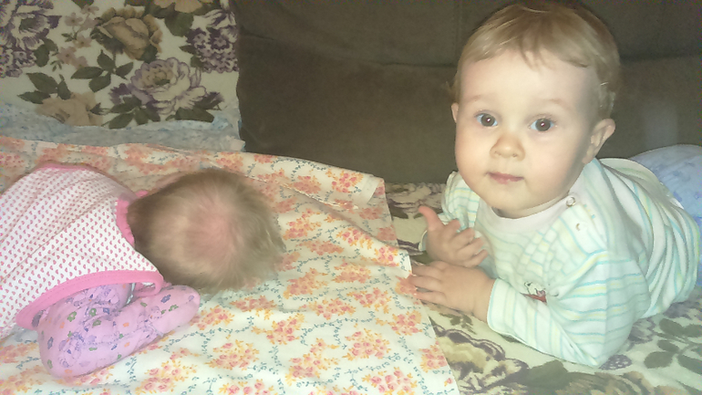 Итак, Святослав, год и три с половиной месяца. Балуется, не всегда слушается. Но сестрёнку встретил по доброму. Целует её, пытается погладить, не аккуратно пока. Дергает за ручки ножки)) укачивает колыбельку, поёт ааа-ааа)) Помогает мне, выбрасывает памперсы, протирает пол)) папин сын, любит с ним что-то делать, особенно отвёрткой крутить)) Научился сам засыпать в своей кроватке. Почти не просыпается, когда сестрёнка кричит. Если проснулся, без проблем уснёт. Визжит громко, иногда пугает Дуняшку, но она уже привыкает))