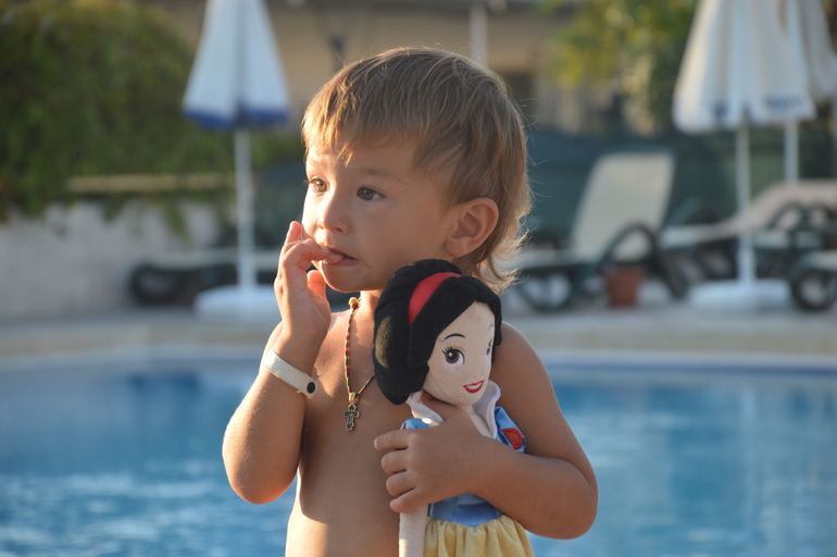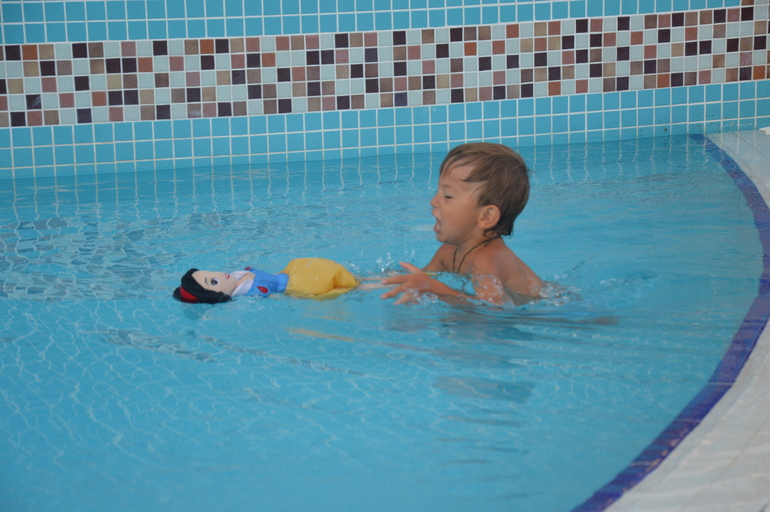 У Захара была супер увлекательная игра-сначала он швырял Белоснежку в бассейн, потом мужественно спасал ее.