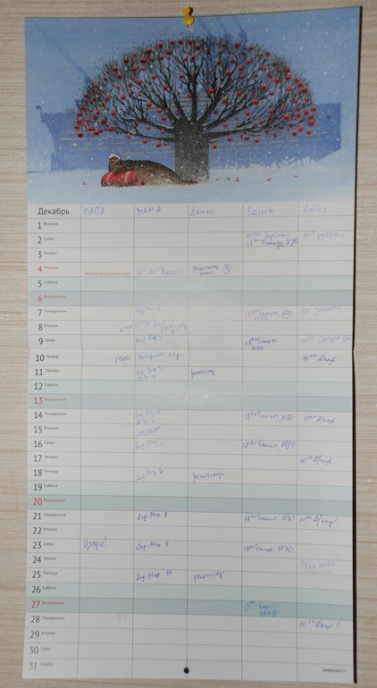 Делимся опытомЯ мама, т.е. я - директор в семье, это моя основная работа! Остальное все потом, подработки, заработки, главная моя работа - Мама. А без плана я как без рук. Вот уже 2 года я пользуюсь календарем-планнингом, первый делала сама, в этом году покупала вот такой (то наш декабрь), висит на кухне. По горизонтали идут столбцы всех членов семьи, по вертикали число/день месяца.