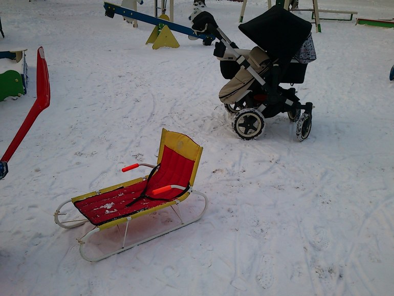 Коляска для погодок, санки складные засовывала в корзину, торчали из нее, но доехать до горы нормально. Малой спал, старшую катала. Или малой в коляске, старшая в санках, наматывала веревку санок на ручку коляски и все ехали. Потом купила вторые складные санки, привязывала их паровозиком и катила, самый клевый вариант. Иногда выходили только с санками - старшая младшего любит катать, а на горке поочереди катались. С этажа спускала все поочереди или сразу, даже не помню, помню очень уставала от зимних проглок, лифта нет,