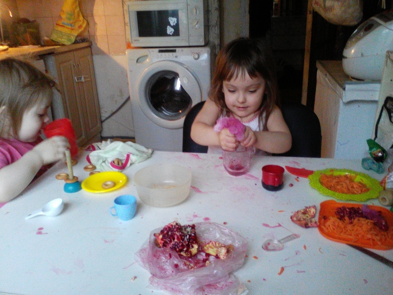и еще у нас новое занятие: Овитаминиваемся! Соня давит через марлю гранатово-морковный сок. сама. ) каждый день - мелкой гемоглобин поднимаем, а то гематологи уже со своими препаратами блин. я даже печенку научилась готовить так, чтоб дети ее ели :))) .. ну и витаминки
