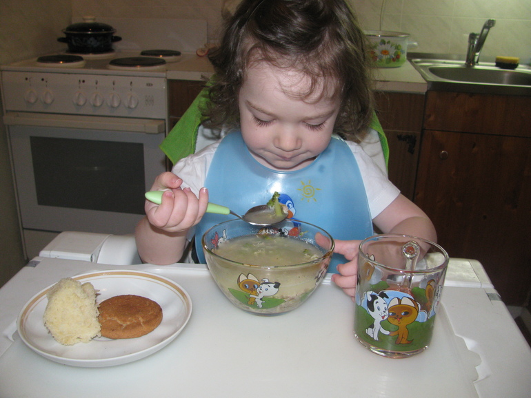 Пока младшая благодушничает в шезлонге на кухне, я варю супчик (стараюсь основательные супы на мясном бульоне варить заранее, т.е.с вечера могу сварить бульон, сделать какие-то заготовки или вечером или с утра,пока маленькая спит; чтобы потом всё быстро покидать в кастрюлю)