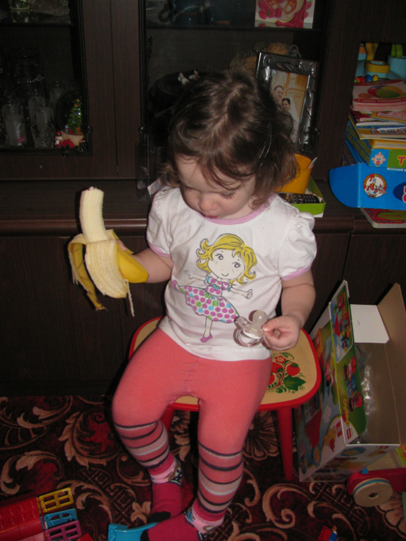 сажусь её кормить, у старшей второй "завтрак": банан/ печенюшка/ компотик/ сок/ пюре