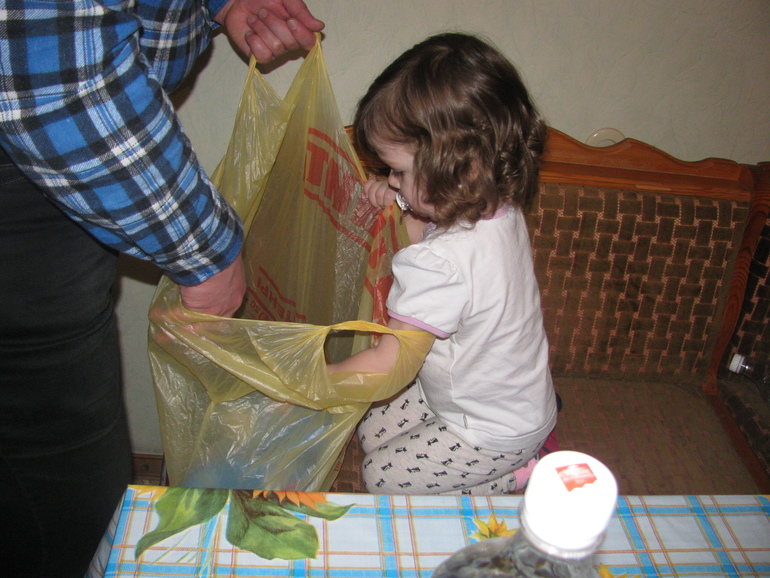 Папа у нас работает не нормированно, поэтому часто работает дома или иногда рано приходит. По дороге заходит в магазин: для Маши радость - разобрать "попУ" (покупки)