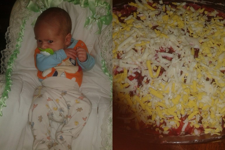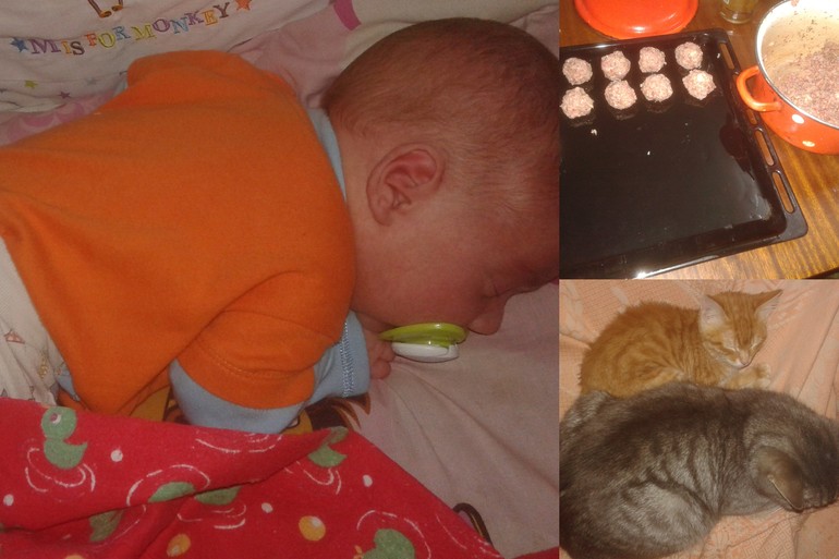 В 12:30 аккуратно перекладываю его спать и бегу делать вариант ленивой шубы. Вообще заметила, что у меня практически весь день проходит на кухне. Это начинает кумарить, но особо вариантов нет, все хотят кушать. Поэтому беру вчерашнюю гречку, которую из-за наличия блинов никто есть не захотел вчера, а если с ней что-то не придумать будет стоять неделю. Добавляю туда фарш и… бегу хватая по дороге котов и выгоняя их из кухни к Алеше, 13:30 перекус, а мне не хватило рук с двумя котами, чтобы взять себе чай