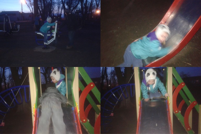 Выходим с сада, уже стемнело, отпускаю детей на площадку, она сразу за территорией школы. Пока я туда дохожу, детвора уже развлекается. Фото в процессе как всегда не очень))))