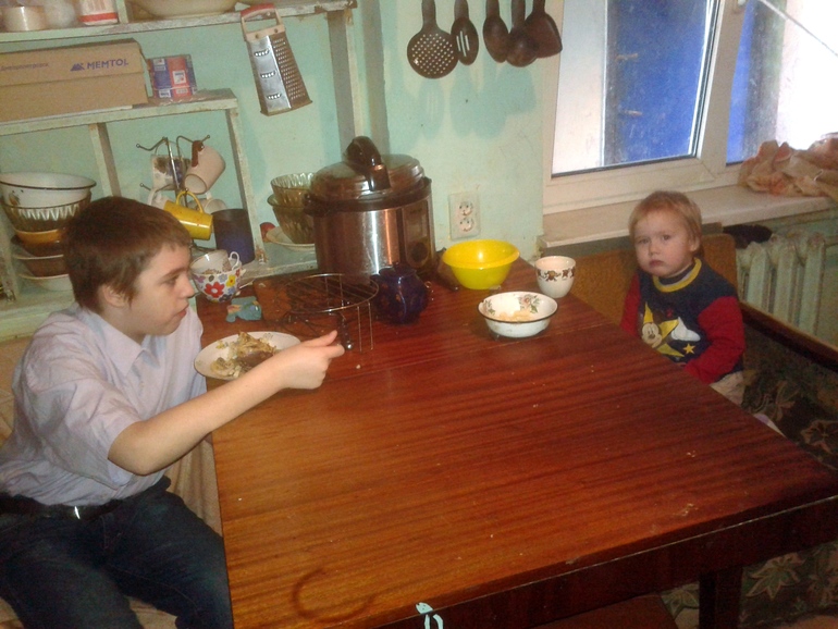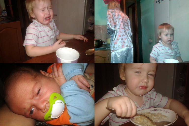 У Андрюшика очередной псих, т.к. не дали ему ложку с цветочками. Детвора кушает макароны с молоком. Им все нужно с молоком.
