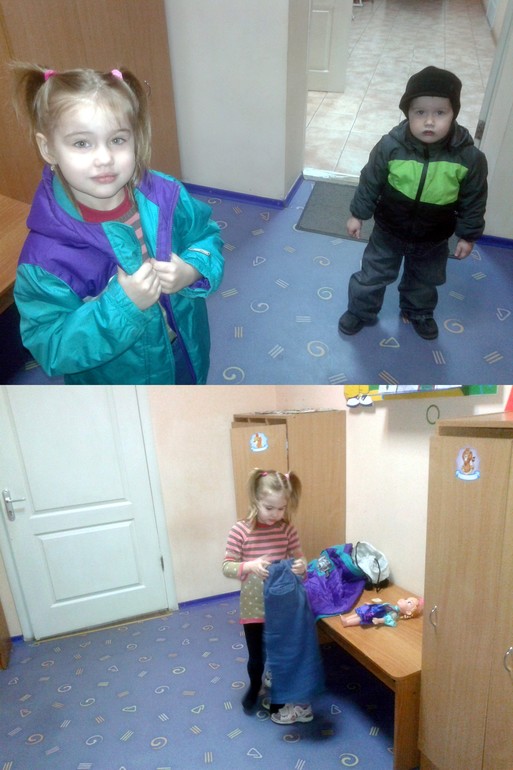Садик у нас маленький, всего 2 группы. Поэтому Аню отправляю раздеваться, а сама помогаю Андрею.