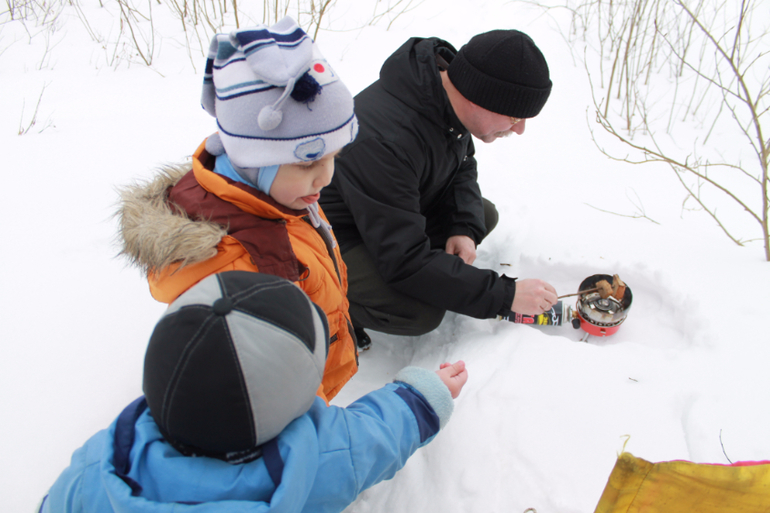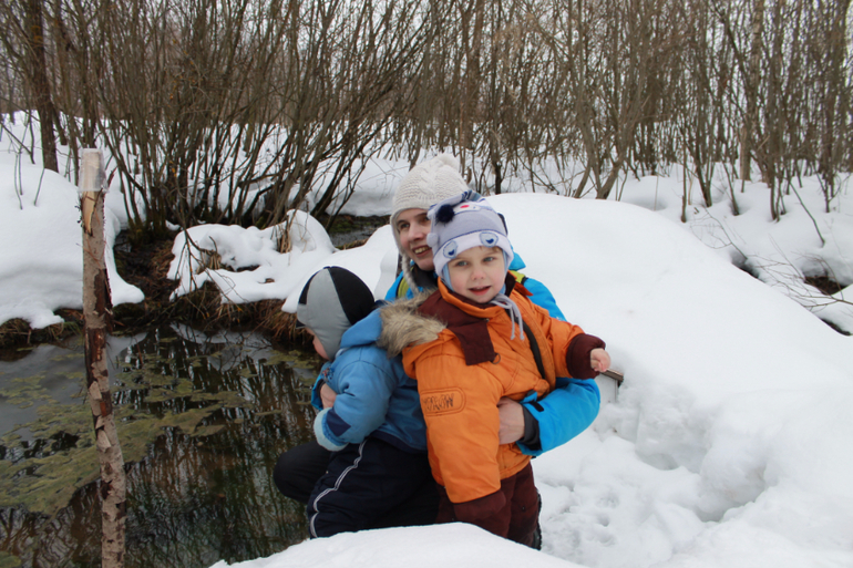 Всю зиму "клянчила" у мужа сходить с нами куда-нибудь в ближний лесок ("на поход", как говорит Серёжа). Выбрали время в конце концов, отправились к роднику в небольшую рощицу, потом спустились к речке (мы живём на окраине города, поэтому далеко ходить не требуется). Посмотрели на родник, Миньку всё тянуло туда окунуться, еле удерживали, Серёжа просто заворожённо смотрел, как вода пробивается из земли. Потом на портативной плитке поджарили хлебушек - умякали дети только так, попили чай из термоса. В общем, программа выполнена. Спустились дальше к реке, но там всё-таки сильный ветер, да и устали оба, начали капризничать, так что повернули домой.