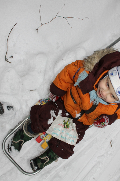 Серёгу два раза получилось поставить на лыжи. Про первый раз писала, второй раз примерно так же был, только с нормальными креплениями, поэтому у него лучше получалось кататься, даже немножко объезжать препятствия. минут 15 во дворе - устал, начал падать и расстроился. Потом, когда ходили с ним по лыжне здоровья (он был на санках), всё смотрел на лыжников- особенно на детей - и говорил: "Вот видишь, а мальчик не падает!" Это я его так утешала, что когда учишься кататься на лыжах, бывает, что падаешь, расстраиваться не надо. Но Серёга пока не увидел, как кто-то из детей упал, не успокоился: всё считал что только он один такой неумеха...