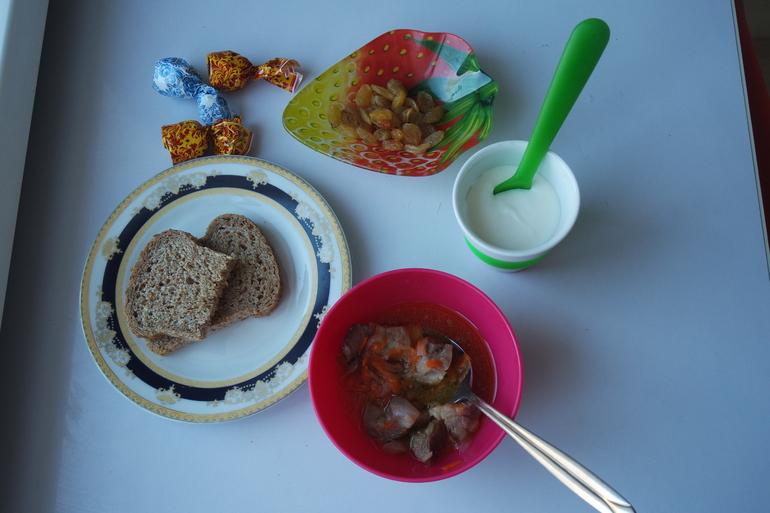 15-40 Обед.Разогрела вчерашний гуляш, сметана, изюм и чай с вкусными и красивыми конфетами