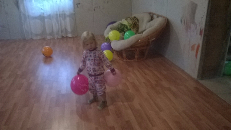 Дальше о ней будет мало, честное слово, она целый день играла в шарики)) На двухлетие мы ей не покупали подарок, я притащила ей ворох летающих шаров, больше и ничего не надо было, прошло 5 месяцев... ситуация не изменилась))Немного построила...