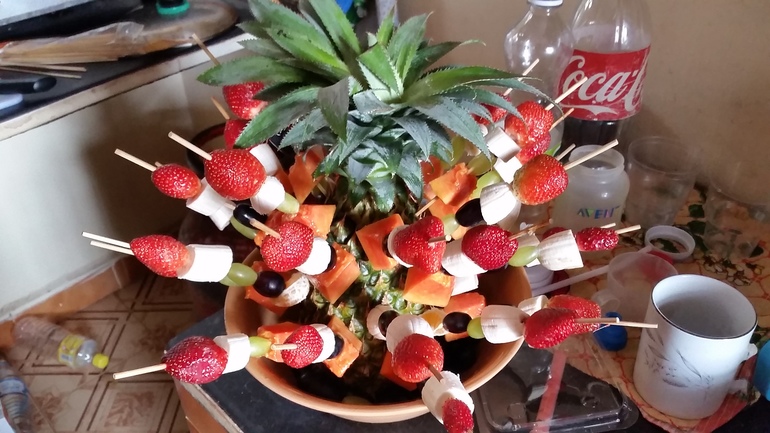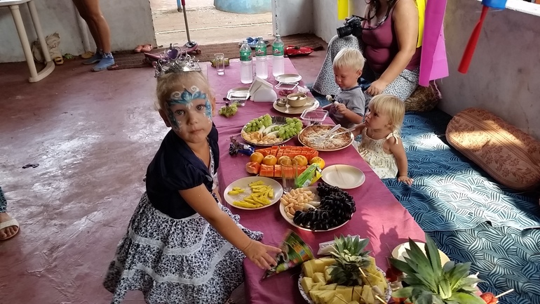 Нашли ресторан, где договорились арендовать площадку совершенно бесплатно. Заказали у них пиццу, местные пельмешки и картошку фри. Закупили украшения для площадки, наняли аниматоров и аквагрим. Пригласили ребятишек. Всего было 9 малышей)