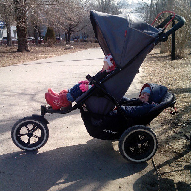 Ездим мы по-прежнему на своем любимом филе)) только теперь Митя впереди,а сзади Ваня.Маша бегает ножками,если устает,а нам надо далеко идти,то садится на подножку. Если гуляем с папой,то Маша у него на шее. Как он говорит:"Еще моя дочь ногами не ходила!")))) Не могу нарадоваться на нашу колясочку! По любой дороге едет легко! А у нас раздолбаны не только дороги,но и тротуары - яма на яме! Но Phil&Teds Navigator v2 - вездеход просто! На дня видела мамочку с грако дуо. Посочувствовала бедной. На каждой яме колеса в разные стороны,она бедная толкает из последних сил,приподнимает передние колеса... Впереди сидел крупненький мальчик лет двух ,а маленький сзади лежал и упирался ногами в спинку. По мне так обоим было тесновато,особенно в весенне-зимней одежды. Но это субъективное мнение,тк я катала эту коляску только в магазине,когда выбирали 2 года назад себе погодковый транспорт. Но и тогда ощущения были противоречивые. Вроде легкая,но это как копейку водить после лексуса))). В нашем городе выбор такого транспорта не велик,в основном на заказ. Я только в одном магазине встретила грако и фил в наличие.