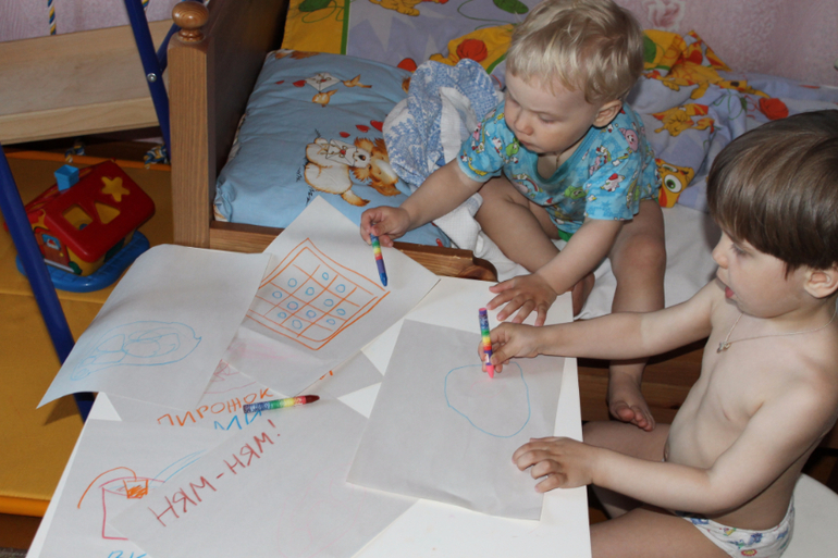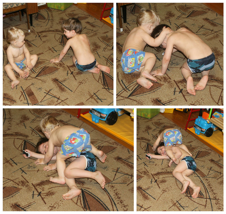 Вечер. Серёга притащил из кладовки игрушки, одна перепала Мите. Тот сидит и стучит ей громко в пол. Серёга своей тоже. Цыкнула, старший перестал, младший с хитрой улыбкой долбит ещё сильнее. Последнее предупреждение - ноль внимания. Отобрала, унесла на стеллаж. Митя в слёзы.