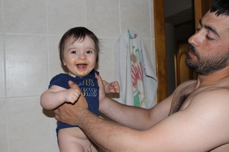 Дети стали находить общий язык. Богдан требует чтоб братик купался вместе с ним. Тимуру это тоже очень нравится) плескаются, радуются) приятно смотреть. Есть конечно и ревность, Богдан постоянно пытается спрятать брата под одеялом или накрывает подушкой, когда тот ползает.