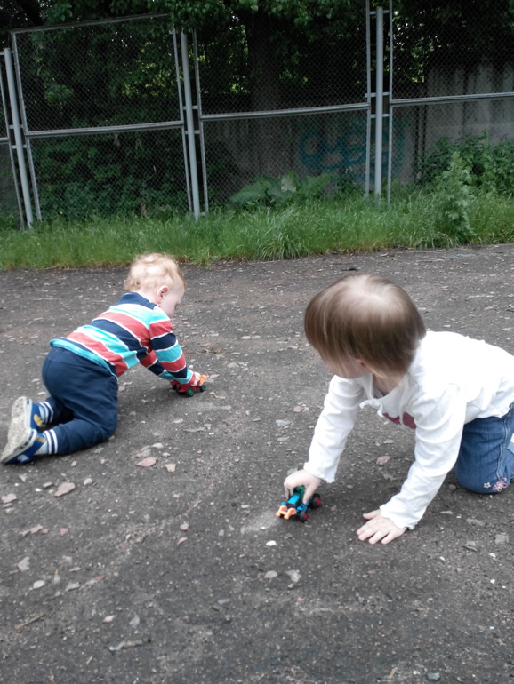 18.40 - выходим. Идем на стадион. Дети играют машинками, с Вероникой играем в догонялки.