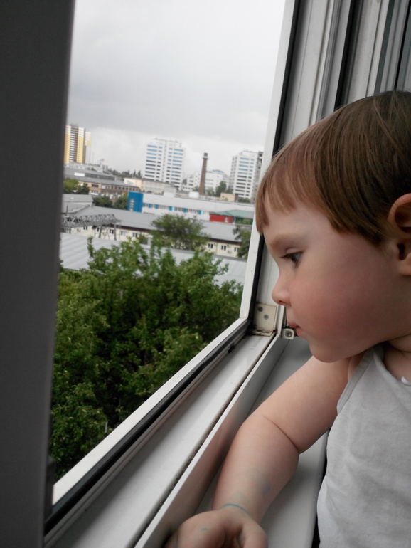 14.00 - Андрей спит. Вероника просит чай. Потом заканчиваю уборку в ванной. Идем с Вероникой на балкон смотреть грозу. Я пью вторую чашку кофе. Рассказываю дочке про гром, молнию, ветер и дождь.