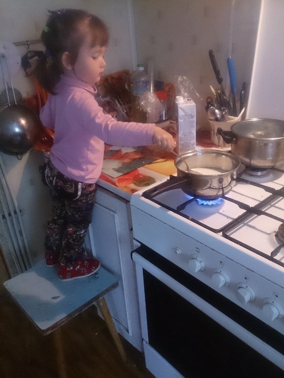 . Потом мы пошли варить кашу, где Тасюня принимала активное участие. Она вообще любит помогать готовить, особенно есть муку....