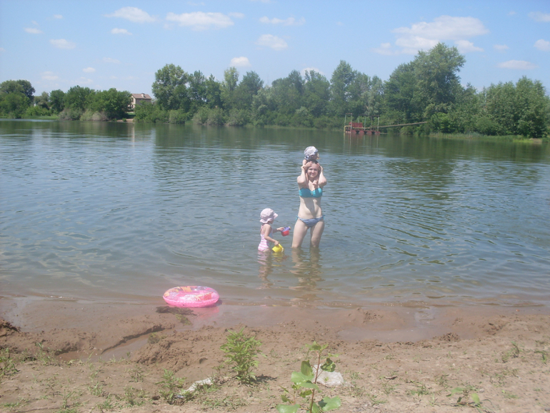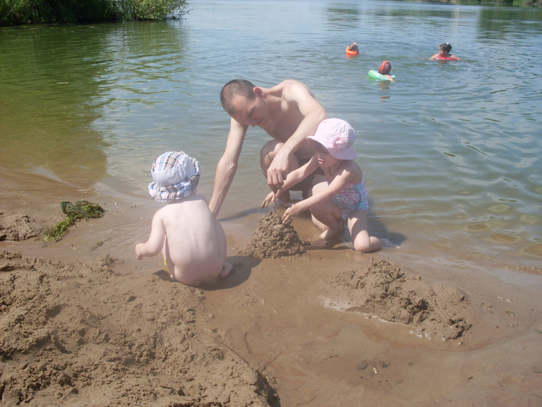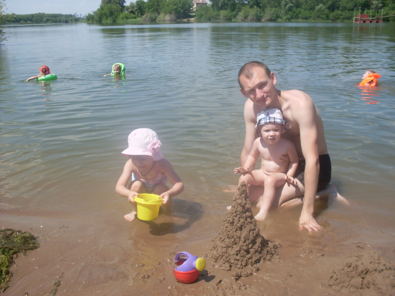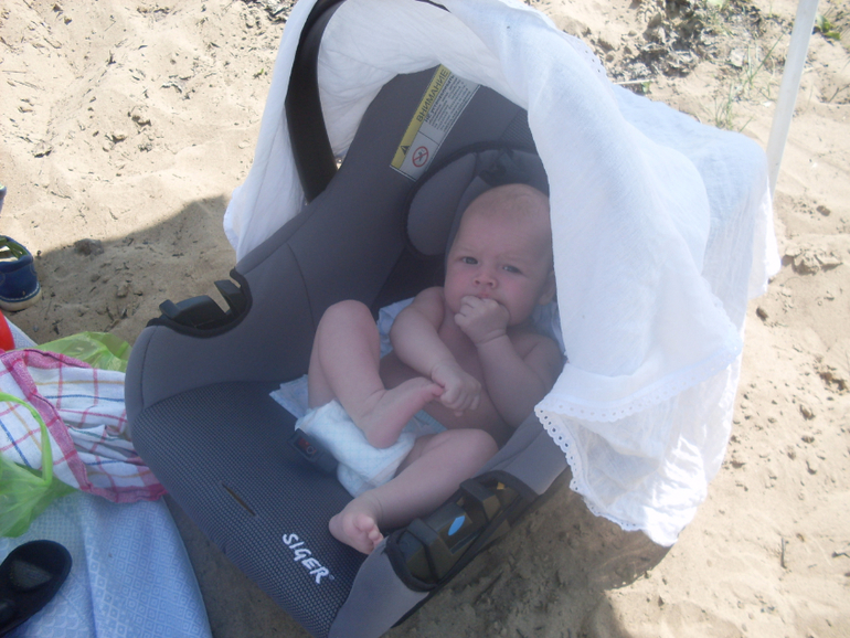 В понедельник поехали на дачу.Повалялись на пляже))) Подгорели все!Включая Ваньку,хоть он и лежал в теньке!