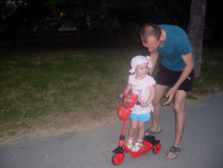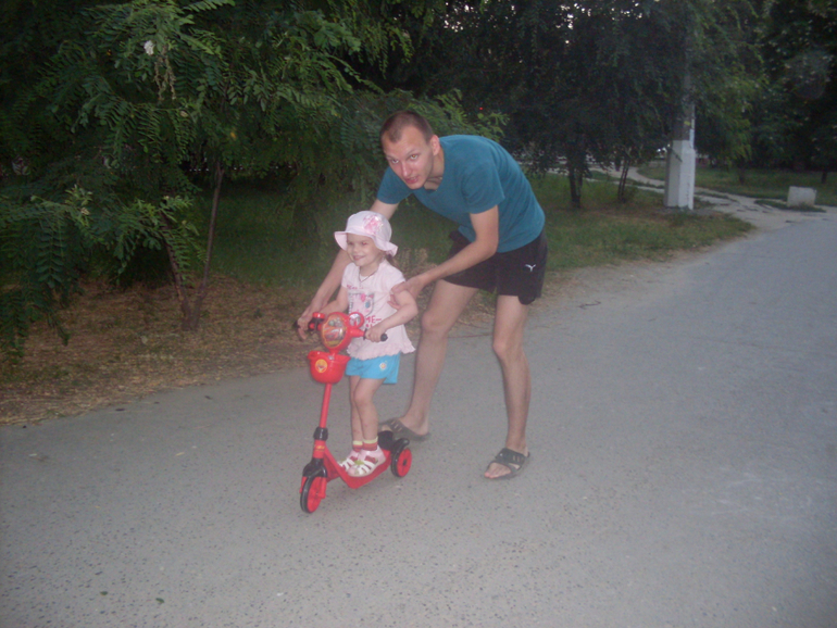 Папуля учит Машуню кататься на самокате.Интереса хватило на 15 минут)