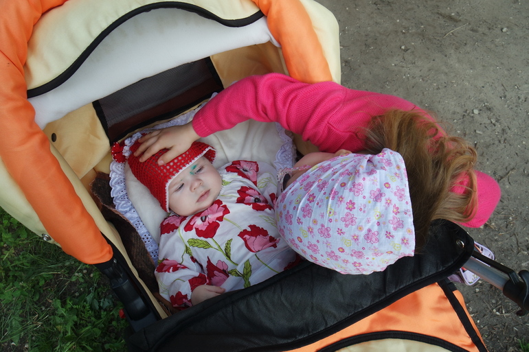 Очень любят младшую сестренку). На прогулке катают коляску)